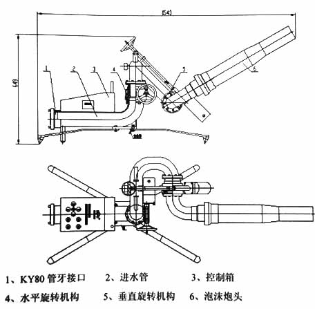4、水平旋轉機構 5、垂直旋轉機構 6、泡沫炮頭
