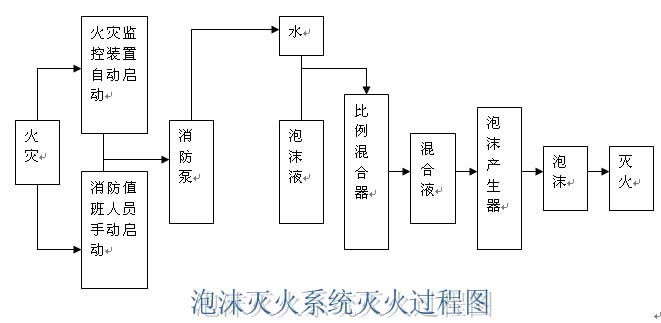 泡沫滅火系統(tǒng)由水源、泡沫消防泵、泡沫液儲(chǔ)罐、泡沫比例混合器、泡沫產(chǎn)生器、閥門(mén)、管道及其它附件組成。